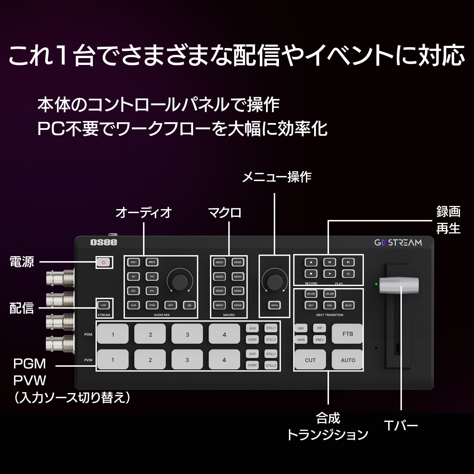 内蔵のGUIと、macおよびWindowsの両方に対応したOsee「ゴーストリームソフトウェアコントロール」アプリ、さらに「Stream Deck(ストリームデッキ / エルガト製)」と接続できるBitfocus「Companion(コンパニオン)」アプリの使用が可能。さまざまな方法で操作を制御できます。【豊富なキーエフェクトとトランジション】