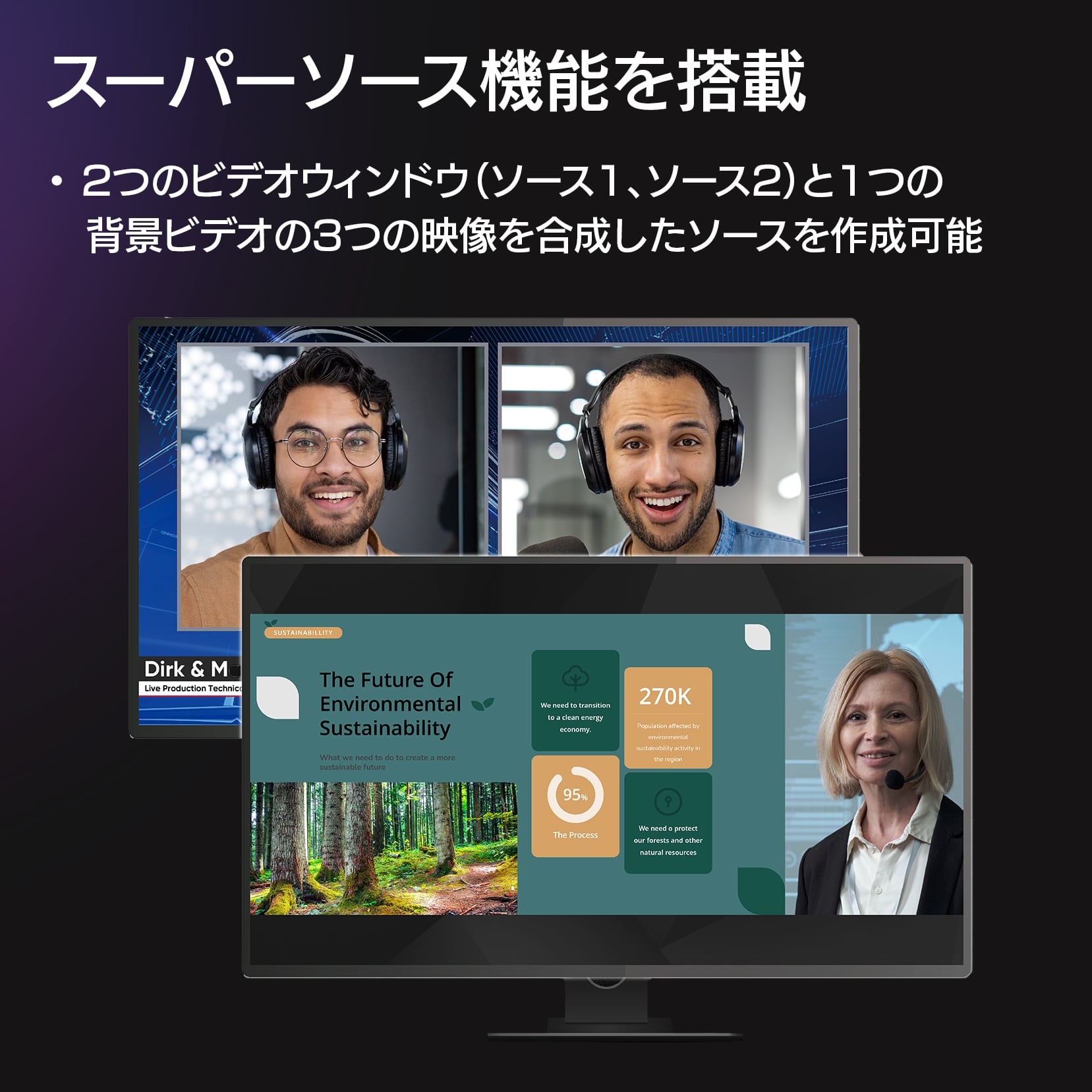 スーパーソース機能により、2つのビデオウィンドウ(ソース1、ソース2)と1つの背景ビデオの、3つの映像を合成したソースを作成することができます。このソースは、ほかのビデオ入力と同様に利用でき、コンポジションエンジンにシームレスに統合されます。ビデオウィンドウと背景のソースは、ビデオ入力や静止画などの内部生成信号から任意に選ぶことができます。さらに、各ビデオウィンドウのレイアウト、サイズ、位置、境界線は自由に変更でき、視覚的なプレゼンテーションに最適です。