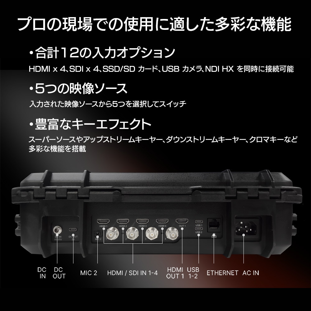 キットの重量は約5kg。コンパクトなデザインで、携帯性と耐久性を実現します。どこへでも無理なく持ち運びができ、すぐに配信が始められます。【充実した入力オプション】