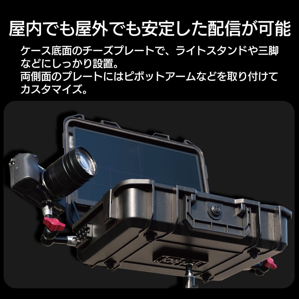 ハードケース底面のチーズプレートでライトスタンドや三脚などにしっかり設置でき、屋内でも屋外でも安定した操作ができます。両側面にあるプレートにはピボットアームを取り付ける等の拡張ができ、現場に合わせてさまざまなカスタマイズが可能です。| 価格 | オープンプライス |
