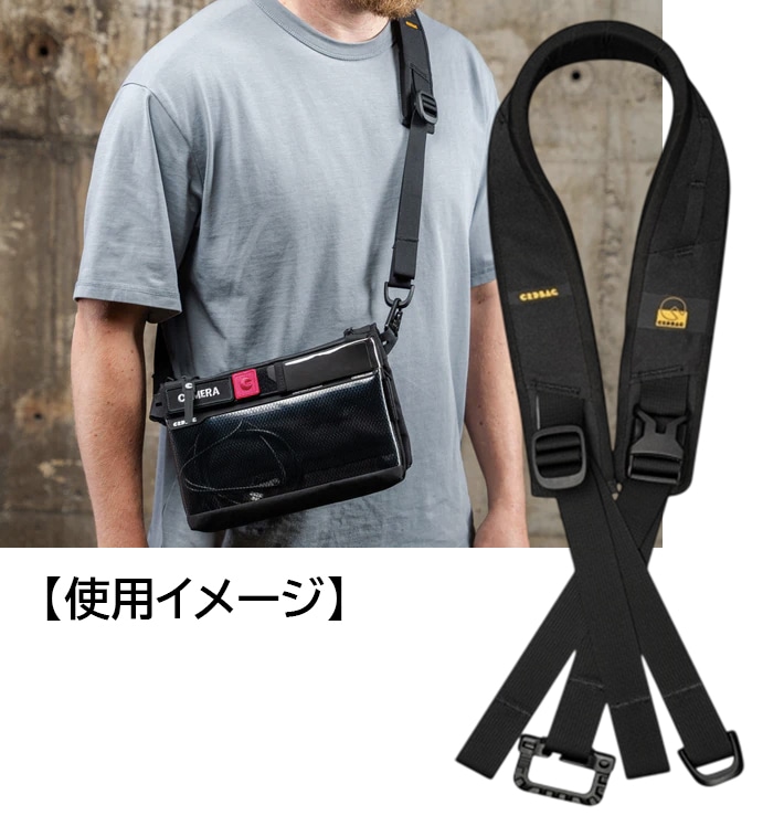 ストラップの長さは約70-140cm まで調節可能で、分厚くクッション性のある生地を採用。