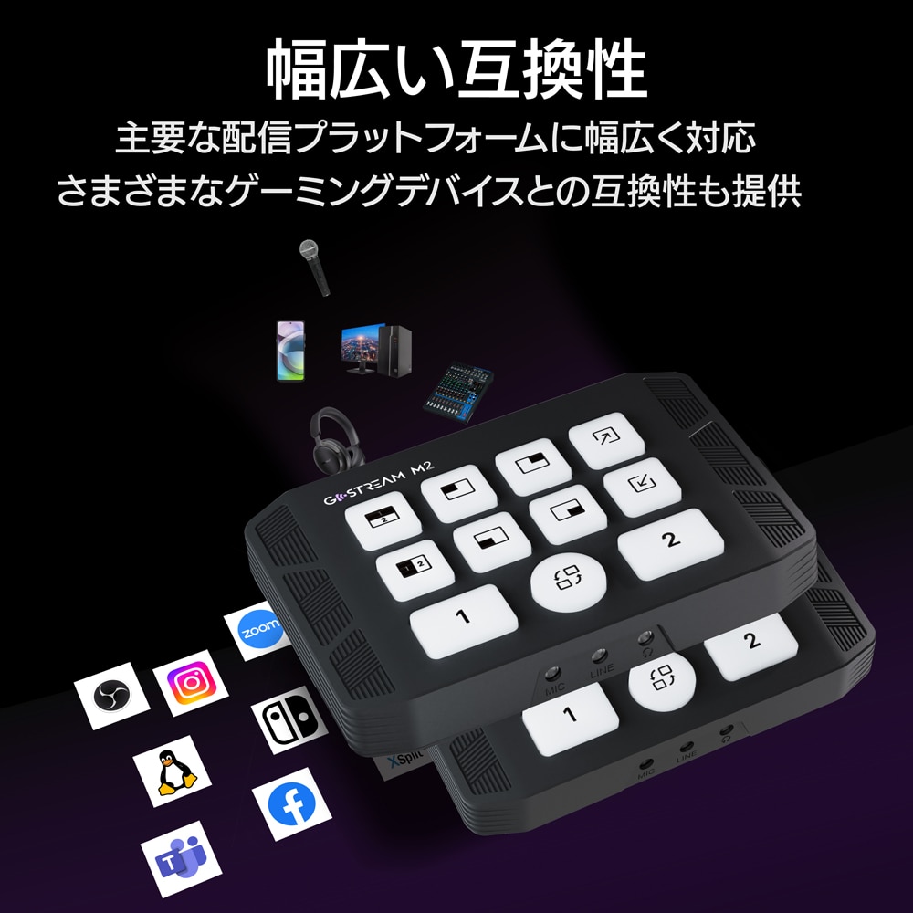 Windows、Android、macOS、Linuxなどのシステムをサポートしています。OBSや、VLC、Teams、Zoom、XSplit、Potplayer、YouTube、TikTok、Instagram、Facebook Gamingなど、主要な配信プラットフォームに幅広く対応します。また、XboxシリーズやPS5、PS4、Switchなどさまざまなゲーミングデバイスとも互換性があります。