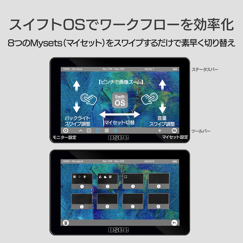スイフトOSのタッチスクリーンがクリエイティブなワークフローをサポートし、撮影現場の作業効率を高めます。】フレーミング、露出、フォーカスチェックなど、重要な映像チェックタスクを効率化する、カスタマイズ可能な「Mysets(マイセット)」を複数設定できます。異なるマイセット間の切り替えはスワイプするだけの簡単操作で、撮影中にメニューを探す必要がありません。【1000nits デイライト表示可能な明るさ