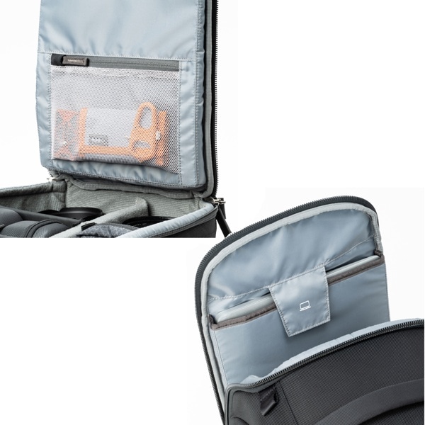 奥行きのあるメインコンパートメントはバッグ前面から大きく開き、グリップ付き一眼カメラや長さのあるレンズを縦に収納可能です(※)。また、フロントパネル内側には、メッシュポケットとノートPCを収納できるパッド付きスリーブが付いています。