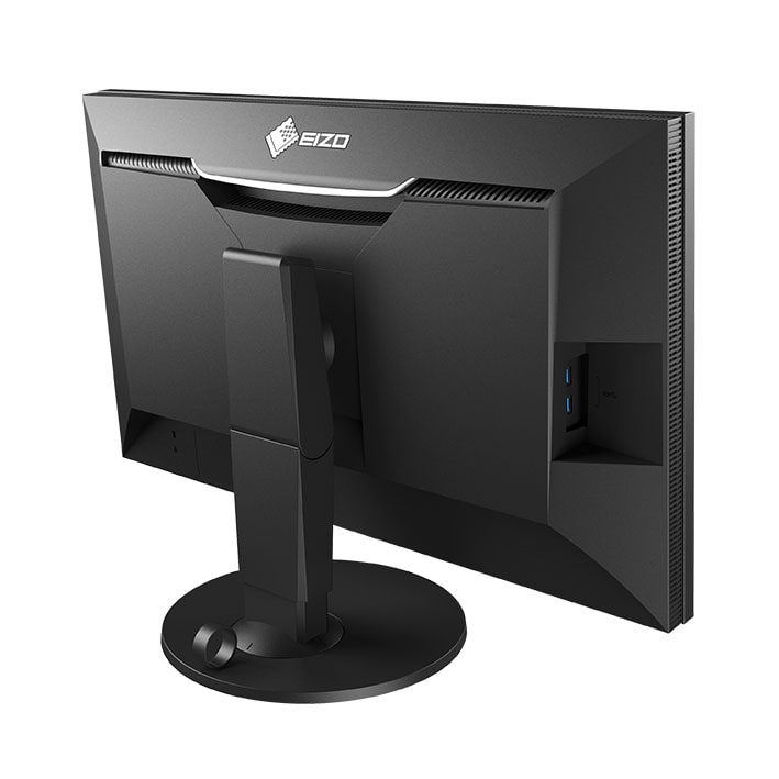 筐体の背面にはUSB Type-C、DisplayPortTM、HDMI®の3系統の映像入力端子を搭載。また、USBポートをモニター側面に2つ、モニター背面に2つ搭載し、USB機器を接続できます。持ち運びに便利なハンドルも搭載しています。