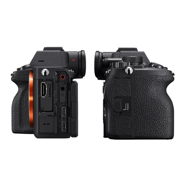 α7 Vでは、望遠レンズを装着する場合や、長時間の撮影時でも疲れにくいよう、ホールド性と操作性をさらに向上。グリップは手のひらに自然にフィットし、シャッターボタンの位置や角度も、スムーズに操作できるよう最適化されています。また、ソニー独自の4軸マルチアングル液晶モニターを搭載。横開きバリアングル液晶モニターとチルト液晶モニターの利便性を兼ね備え、横位置でも縦位置でも見やすい位置に自在に角度を調整できます。さらに、USB PD(Power Delivery)(*1)に対応したUSB Type-C(R)端子を2基搭載したことで、より拡張性が向上しました。カードスロット1(上段)は、CFexpress Type Aメモリーカード(*2)に加え、SDXC/SDHC UHS-II/UHS-Iメモリーカードにも対応。大容量の画像データを高速に記録できます。