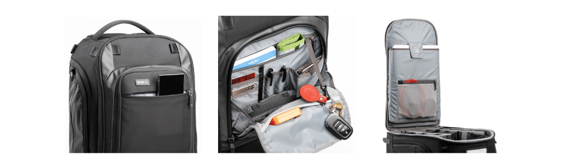 バッグ前面にはマイクロファイバー裏地付きのジッパーポケットがあり、スマートフォンなど使用頻度が高いアイテムの収納に最適です。また、フロントには旧モデルよりも容量を増やしたオーガナイザーポケット、キーランヤード付きジッパーポケット、メッシュポケットを備え、ペンやケーブル、バッテリーなど小物類を整理して収納できます。