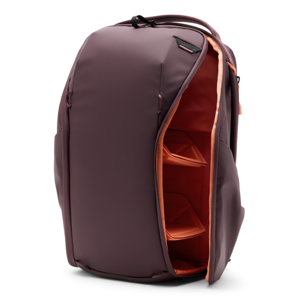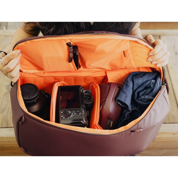 メインコンパートメントは前面のジッパーで大きく開き、自由度の高い中仕切りでカメラやドローンなどの機材や小物を整理して収納できます。