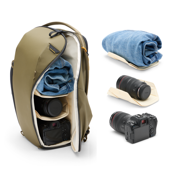 メインコンパートメントは前面のジッパーで大きく開き、自由度の高い中仕切りでカメラやドローンなどの機材や小物を整理して収納できます。
