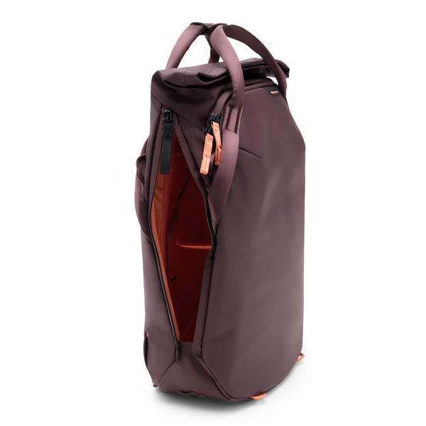 メインコンパートメントへは、バッグ上部の大きく開く開口部と、両側面のジッパーからアクセスできます。