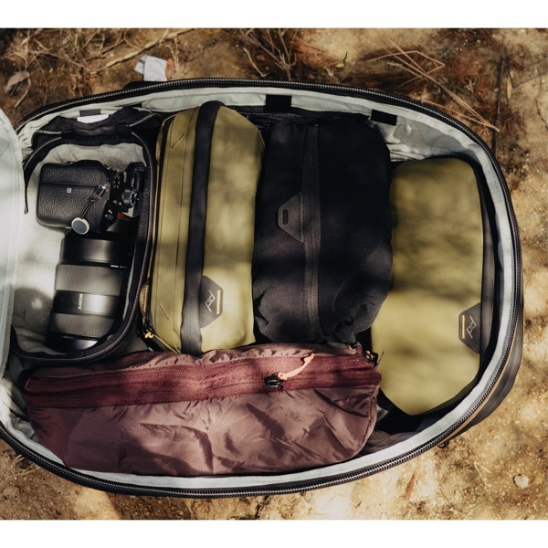 メインコンパートメントへはバックパネルを大きく開いてアクセスでき、パッキングツールと組み合わせることで荷物に合わせてさまざまなカスタマイズができます。