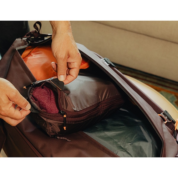 衣類などの収納に適したポーチです。内部仕切りによって清潔な服と汚れた服を分けることができ、内容量に応じてサイズを調節できます。ミディアムとスモールの 2 サイズ展開です。