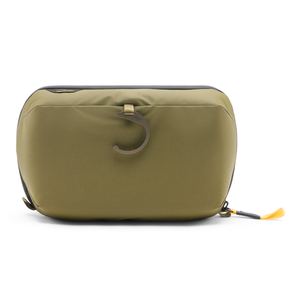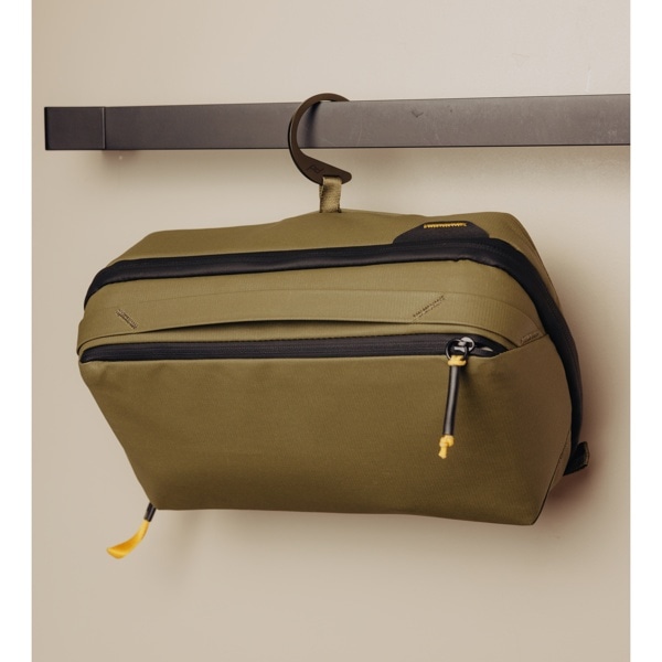 ポーチ背面には、タオルハンガーなどに吊り下げるための丈夫なアルミニウム製フックを内蔵しています。