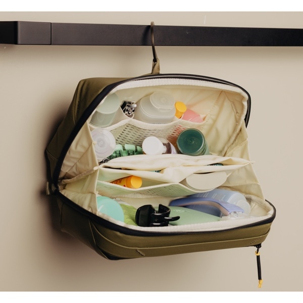 内側にジッパーポケットとマグネットで閉じる歯ブラシポケットを備え、細かなアイテムを整理して清潔に保つことができます。