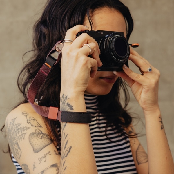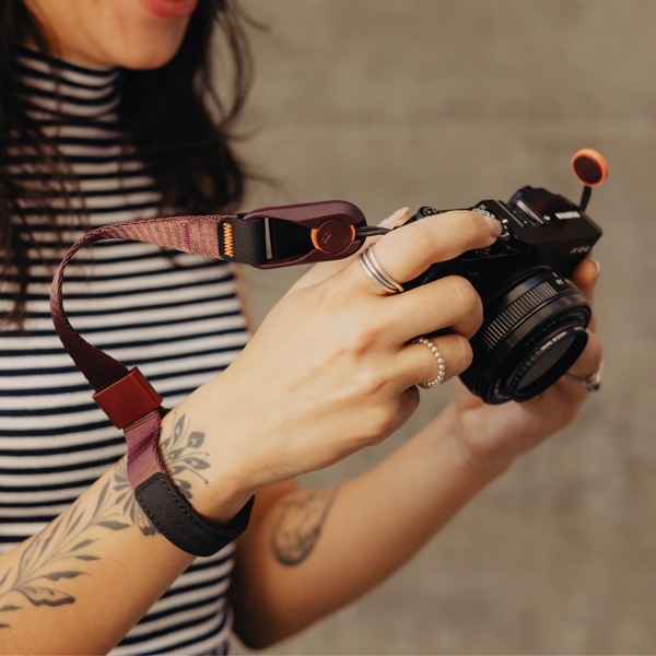 ループサイズを手首に合わせて調節すれば、カメラの落下防止に役立ちます。また、大きなループのままでも使用できます。