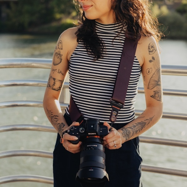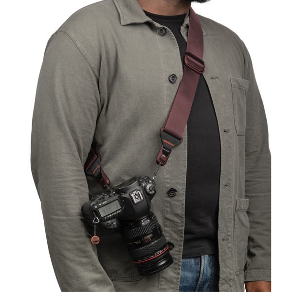ネック部分はパッド入りで、長時間重いカメラを持ち運ぶ場合にも、負担がかかりにくい設計になっています。また、2 つのバックルはワンアクションで調節可能で、素早くストラップの長さを調整できます。