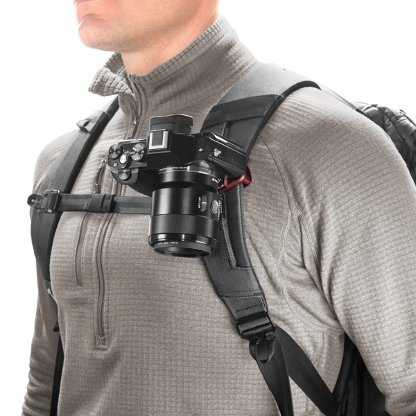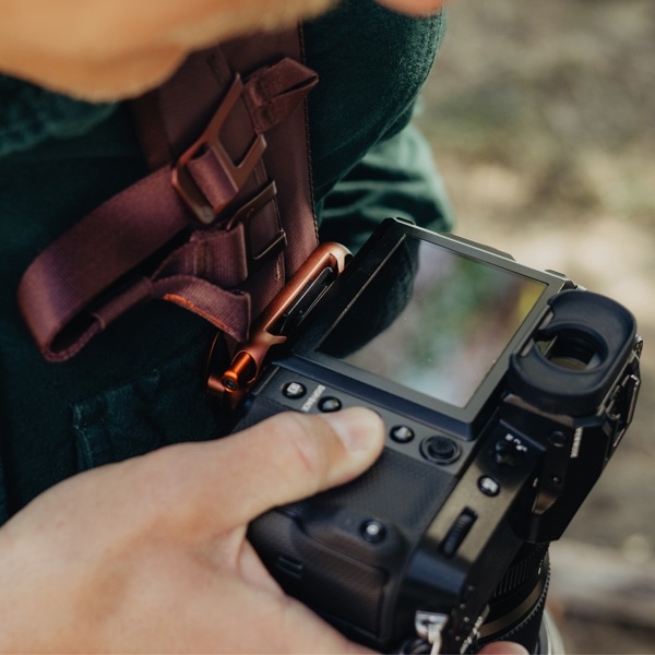 ショルダーストラップや、ウエストベストに取り付けて、カメラ本体を固定し安定させます。