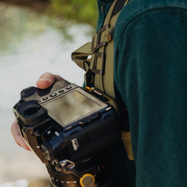ショルダーストラップや、ウエストベストに取り付けて、カメラ本体を固定し安定させます。