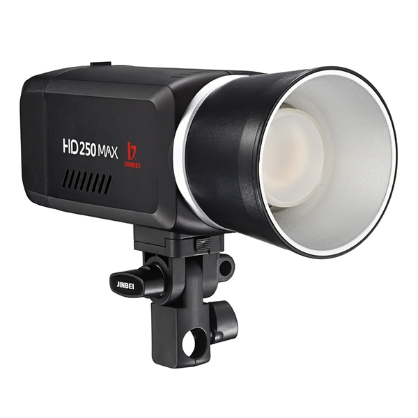 付属のクイックブラケット(角度調節部)にはΦ8mmのアンブレラシャフト受け穴も備えており、簡単にアンブレラバウンスを行うことができます。また、HD-250MAXはJINBEI独自の4c(4つ爪)マウントを採用し、そのまま取り付け可能なソフトボックスやディフューズボールなどの別売アクセサリーをご用意しています。さらに、別売の4c Bowensアダプター(型番:J429)を併用することで、4c(4つ爪)マウントからBowensマウントに変換することもできます。お手持ちまたは別売のBowensマウントアクセサリーと合わせて、より強力で指向性の高い光を表現することが可能です。