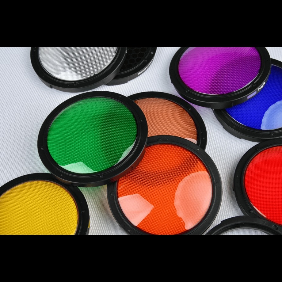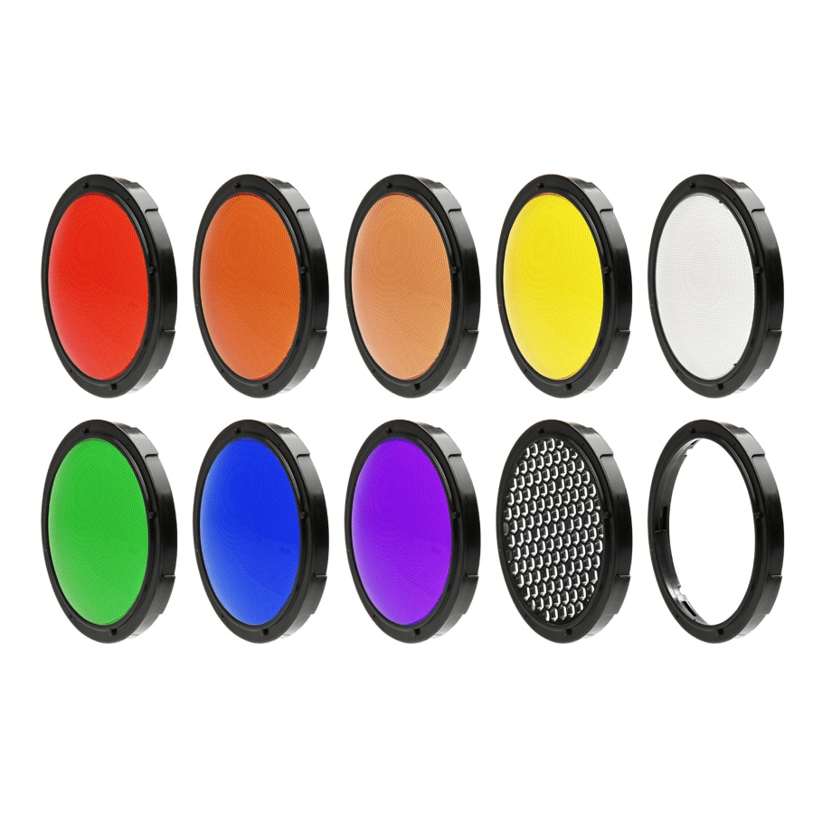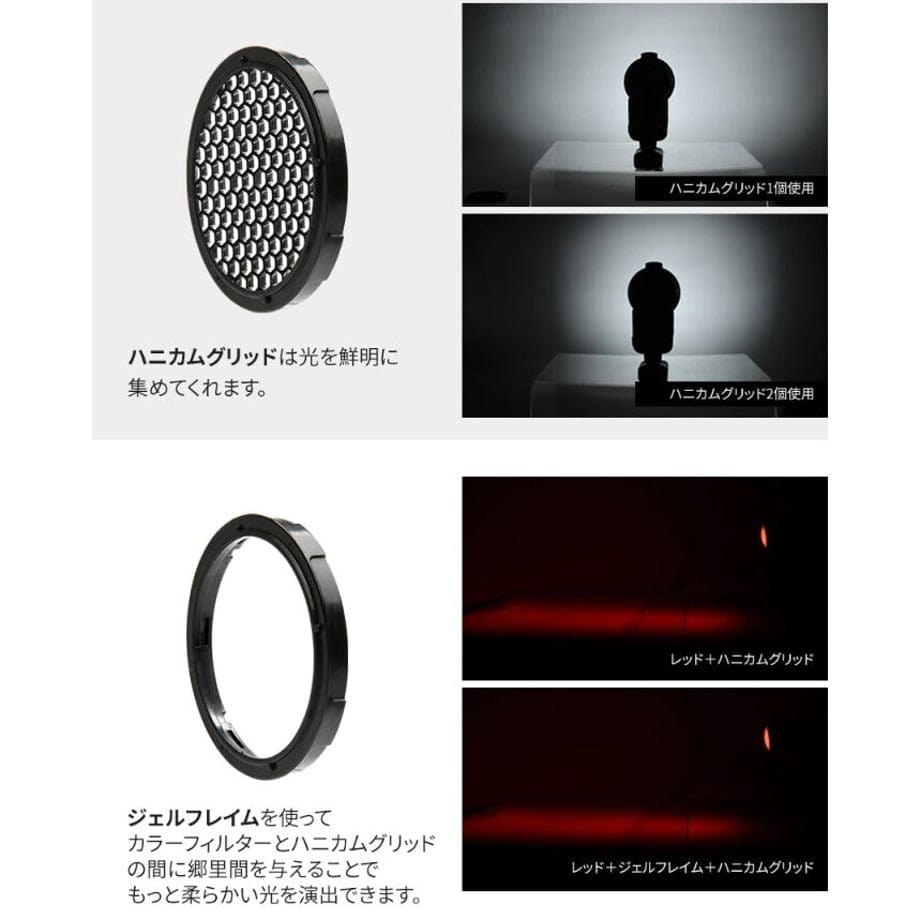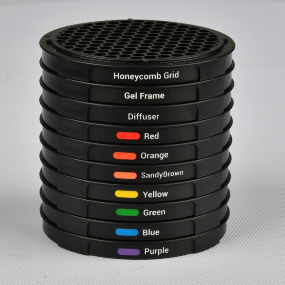 カラーフィルターKIT (Speedbox-Flip Mount専用) は、カラーフィルター7種、ディフューザー、ハニカムグリッド、ジェルフレイムの合計10点がセットになったお得なセットです。
