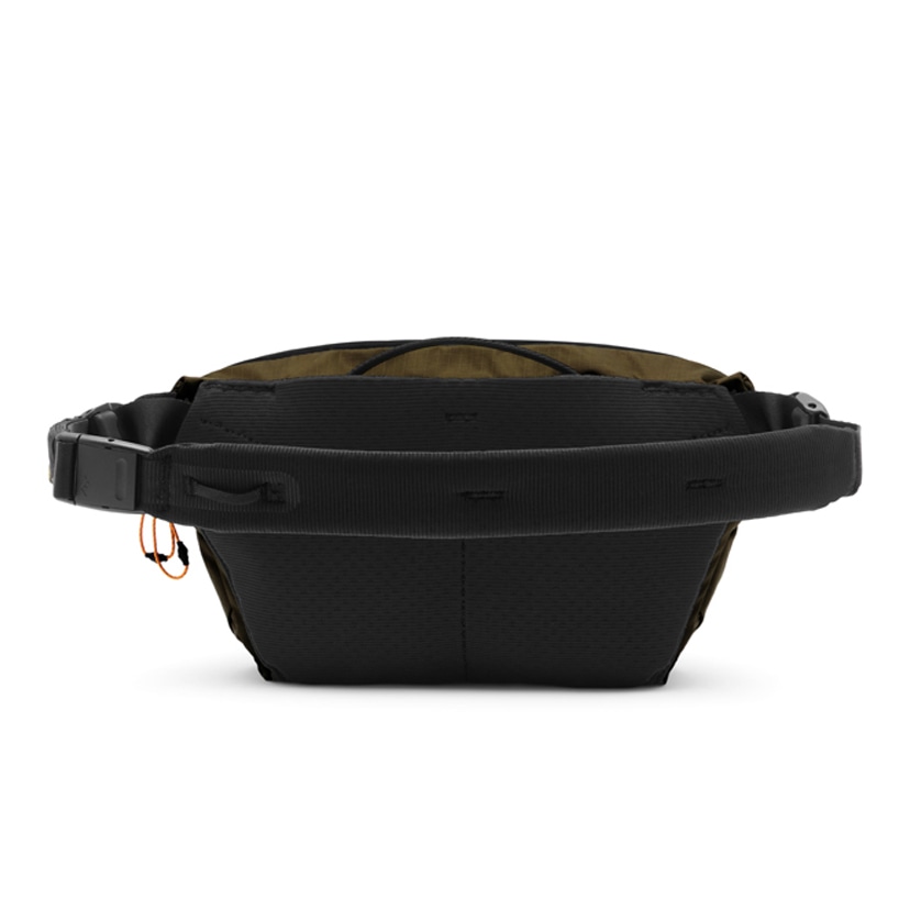 また、ショルダーストラップの長さを調節して、ウエストバッグスタイルへ切り替えもできます。ショルダーストラップを取り外し、アウトドアバックパックのショルダーストラップに取り付けて、チェストポーチとしても活用できます。