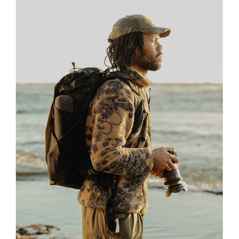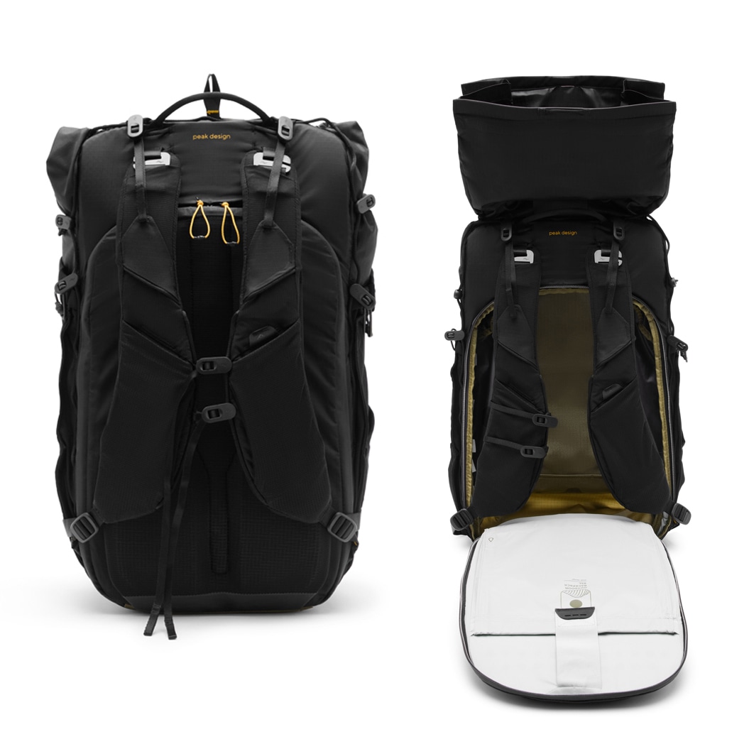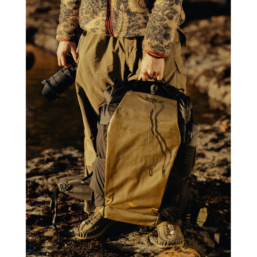 ピークデザインにより考案されたCord Hook™(コードフック)システムとCord Rails™(コードレール)を活用してさまざまなアクセサリーやポーチを取り付けることにより、バッグの機能と容量を拡張します。バッグ背面や各所配置されたCord Rails™(コードレール)による柔軟な取り付けポイントを利用し、付属の「コードフックエクスターナルキャリーコード」と「コードフックギアループ」で、バッグ外側にジャケットや寝袋などを固定できます。ピークデザイン製ウルトラライトパッキングキューブを取り付けることもでき、モジュールシステムの可能性が広がります。