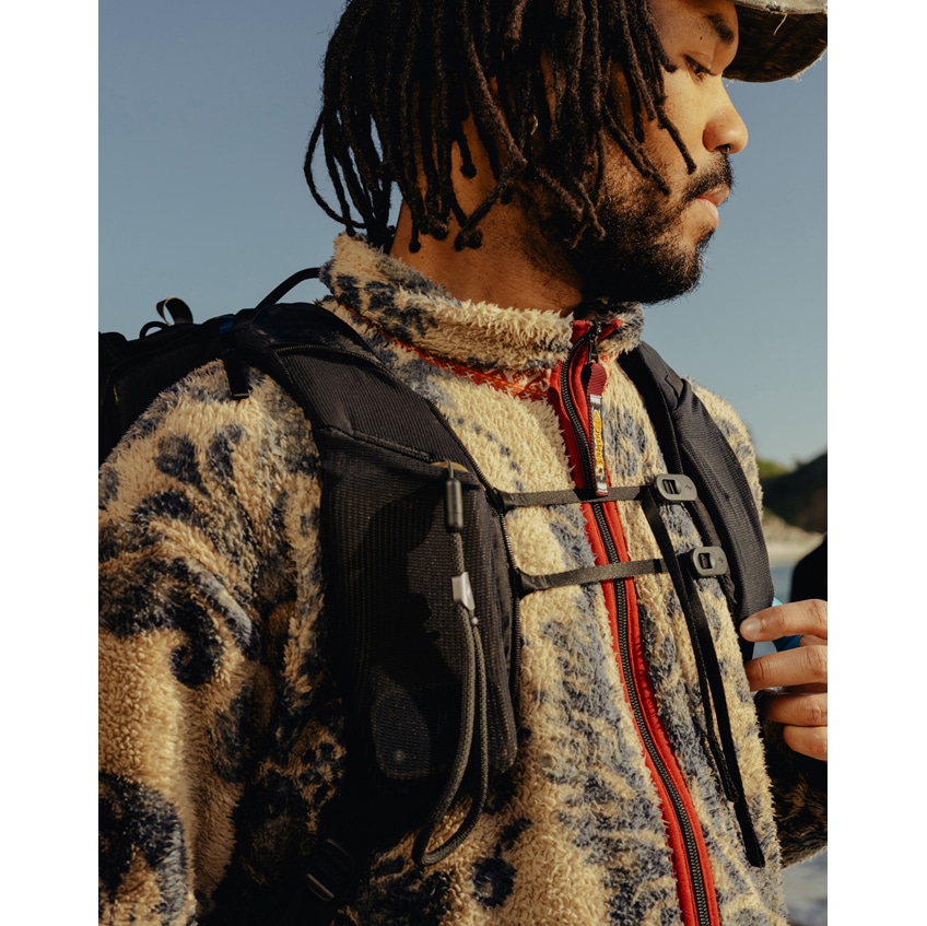 バッグ外側の生地には、軽さと耐久性のバランスに優れ、耐候性のある100%リサイクル素材「Terra Shell™(テラシェル)210D リップストップナイロン」を採用。前面と底部にはTPUコーティングを施した生地を使用し、防水性、耐摩耗性を強化しています。また、バッグ背面とショルダーストラップには、通気性のあるナイロンメッシュを使用しています。カラーは、ブラック、エクリプス、クラウドの3色展開。雨天に備えて、別売りのレインカバー「アウトドアレインフライ」をご用意しています。
