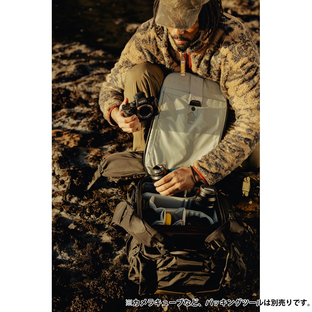 美しく無駄のないデザインの中にも、アウトドアシーンで必要とされるさまざまな機能を犠牲にしないつくりです。バッグ容量を34.5Lから45Lへ拡張できるロールトップや豊富なポケット、小物の収納に便利な内部のメッシュポケットが高い収納力を提供します。別売りのカメラキューブやパッキングキューブ、各種ポーチ類などの「パッキングツール」を活用することで、衣類や食料、キャンプ道具からスポーツ用品、撮影機材まで、あらゆる荷物を収納できます。