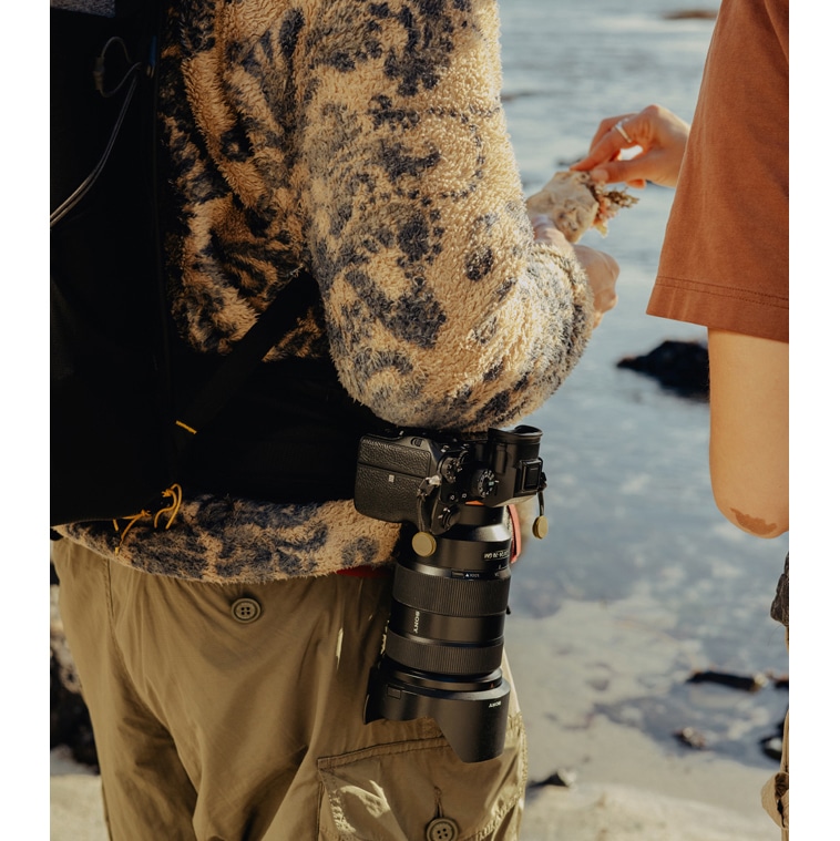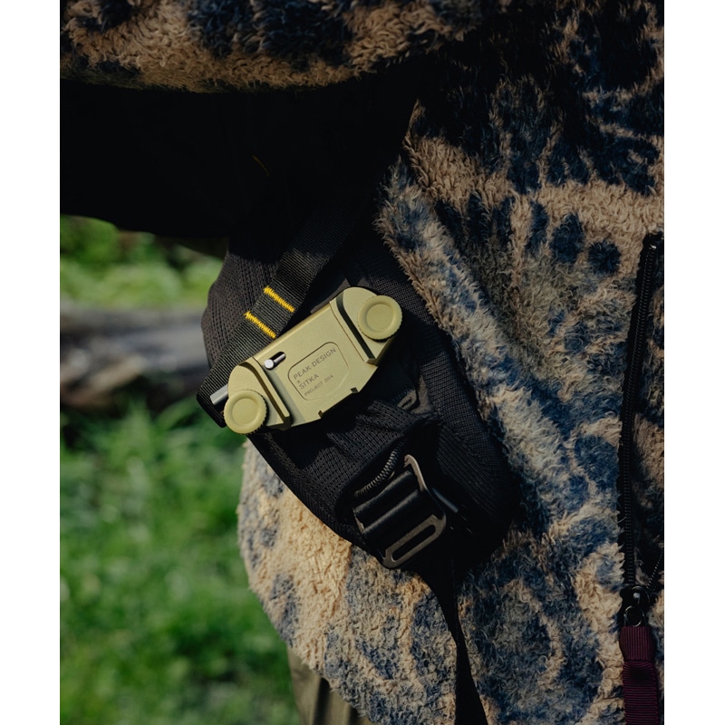 さらに、ショルダーストラップにスマートフォンやサングラスなどを収納できる小さなメッシュポケットと、ピークデザイン製キャプチャーカメラクリップを取り付けるスリットを設け、移動中でも必要なものを素早く取り出せる工夫が施されています。