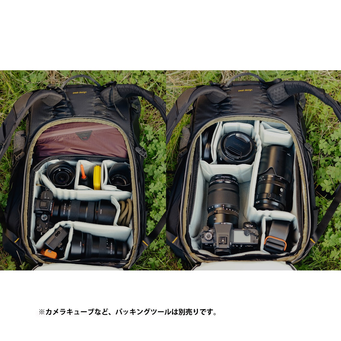 ピークデザイン製トラベルバッグと同様にモジュールシステムを採用し、カメラキューブやパッキングキューブを組み合わせてバッグをカスタマイズできます。45Lサイズには、メインコンパートメントに3ユニットまで収納可能。