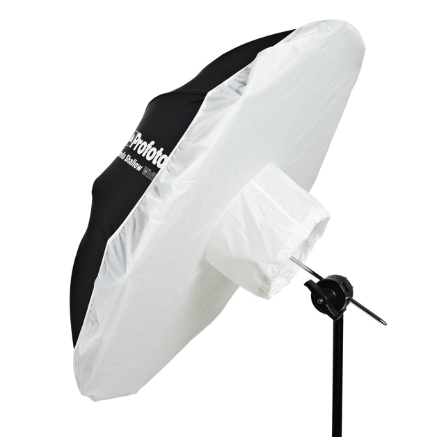 オプションのアンブレラ ディフューザーは、ゴムバンド付きのシャワーキャップのように取り付け可能です。アンブレラ ホワイトまたはシルバーの前面にかぶせると、ソフトボックスに早変わりし、よりやわらかい拡散光を作り出します。アンブレラ ディフューザーは、光の出力を1.5段分落とします。