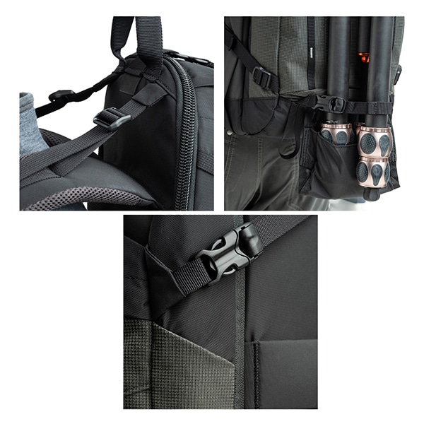 バッグの両サイドにはシンクタンクフォト製のポーチ(別売り)などを取り付けられるアタッチメントを装備。ショルダーストラップとフロントにはデイジーチェーンやトレッキングポール / アックス用ループが設けられ、持ち運べる荷物の容量を拡張できます。両サイドのコンプレッションストラップにはサイドリリースバックルが付き、追加のラッシングポイントとしても活用できます。