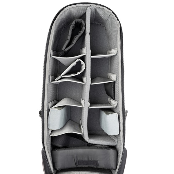 メインコンパートメント内には大型レンズとグリップ付き一眼レフ用の、ピローなどを組み合わせたディバイダーや、5-6本程度のレンズとグリップ付き一番レフ用のディバイダーなどが付属します。