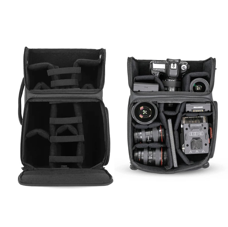 標準レンズを装着した中型一眼レフ2 台、レンズ3-4 本、ドローン1 体などを収納できます