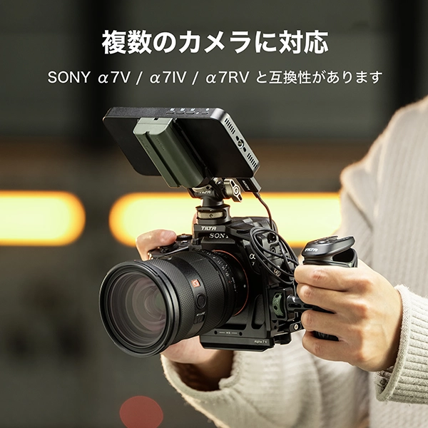 ソニー α7 V用フルカメラケージ プロキットには、Sony α7 V / α7 IV / α7R V に対応するフルカメラケージとトップハンドル、サイドハンドルと15mm LWSベースプレートが含まれます。