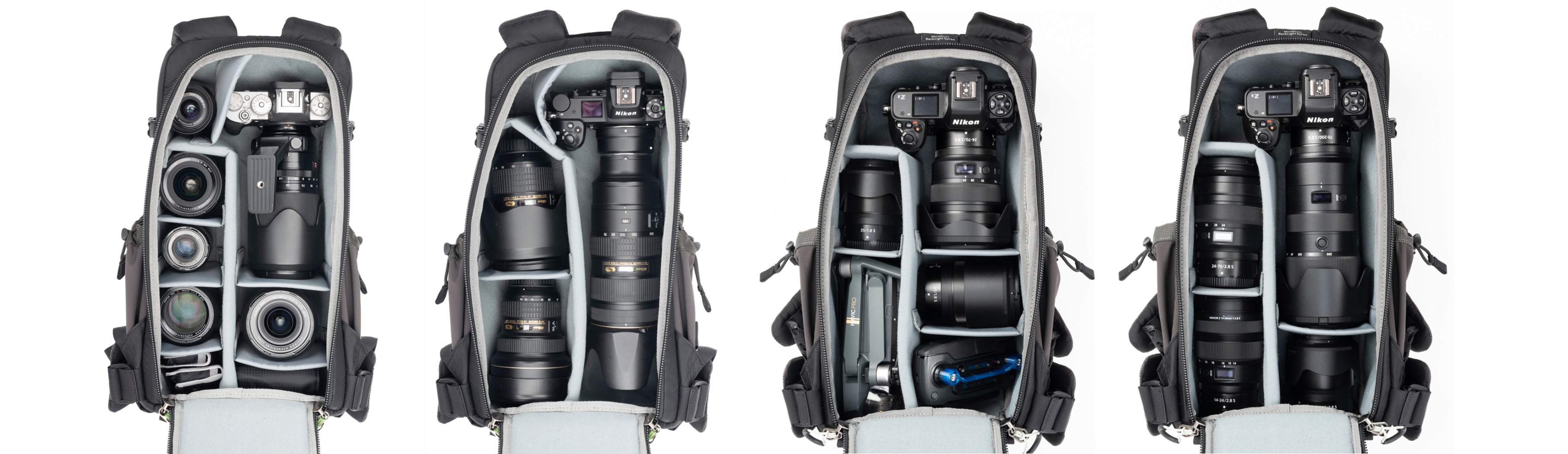 コンパクトながらも、標準ズームレンズを装着した中型一眼レフを収納でき、両サイドにはウォーターボトルや三脚を入れられるサイドポケットを備えています。