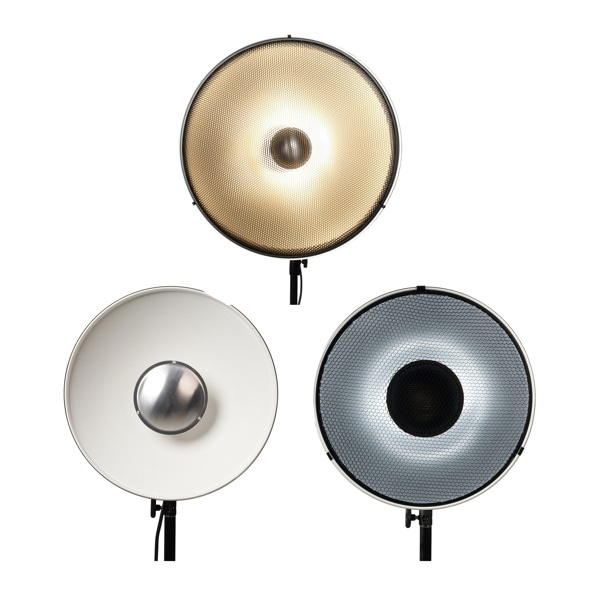 ① ビューティーディッシュリフレクターの内側はオレンジピール加工が施されており、光をより均一に反射します。光はディフレクタープレートに反射して内側に拡散され、集中的でありながら柔らかい均一な光を作り出します。付属のディフューザーを装着することで、さらに柔らかい光にすることも可能です。また、丸型の開口部により、ポートレート撮影において美しいキャッチライトを生み出します。