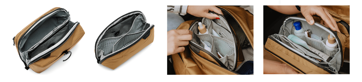 内部は、ウォッシュポーチは3つ、ウォッシュポーチスモールは4つのメッシュポケットに分かれています。さらに、ジッパーポケットとマグネットで閉じる歯ブラシポケットを備え、細かなアイテムを整理して清潔に保つことができます。