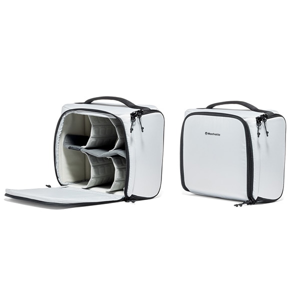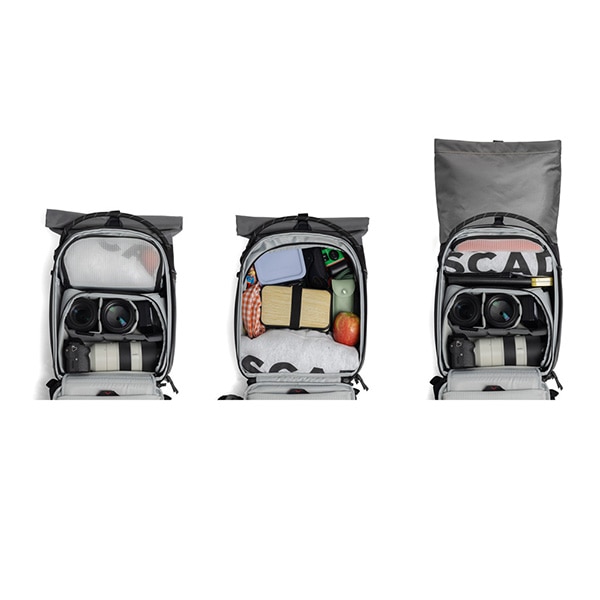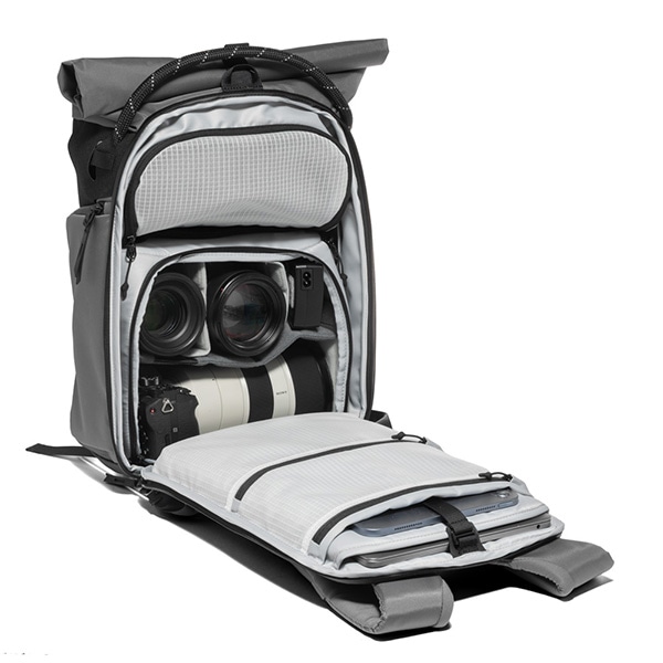 メインの収納部はジッパー式の SmartLift システムで上下に分割できるため、例えば下部にカメラインサート、上部には身の回り品、といった分類収納が可能です。カメラインサートにはバッグ側面のジッパーからサイドアクセスも可能なため、バッグを地面に下ろすことなく素早くカメラを出し入れすることができます。