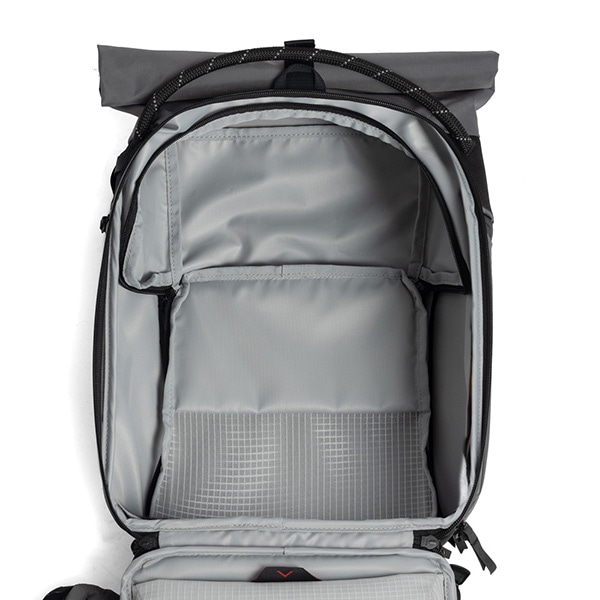 二重ラミネート加工のコーデュラ素材にレーザーカットでスリット加工した FlexGrid パネルには、モジュールシステムのようにアクセサリーやツール、カラビナなどを取り付けることができます。外装には 3 層構造の TriTex 生地を採用し、レインカバーも不要なほどの抜群の耐水性を備えています。YKK の止水ジッパー、PU コーティングされた底面など、雨や埃、摩耗にも強いバッグになっています。