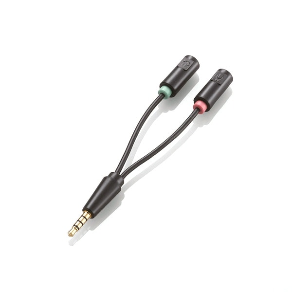 3.5mmミニプラグx2(マイク入力端子・イヤホン端子)を搭載したヘッドセットを、スマートフォンやタブレットPCのΦ3.5mm4極ミニプラグに接続できる変換ケーブルです。