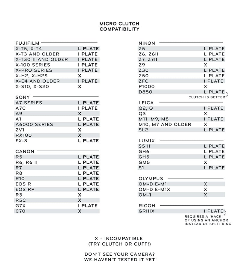 マイクロクラッチには、カメラの形状に合わせて 2 種類のベースプレートをご用意しています。それぞれの対応機種は、ピークデザインが実際に取り付けテストをしたカメラの一覧表をご参照ください。