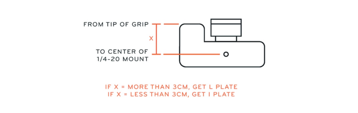 お選びいただく際の判断の目安のひとつとして、下記の図をご参照いただき、ハンドグリップの先端からカメラ側の 1/4 インチネジ穴までの距離を測ってください。