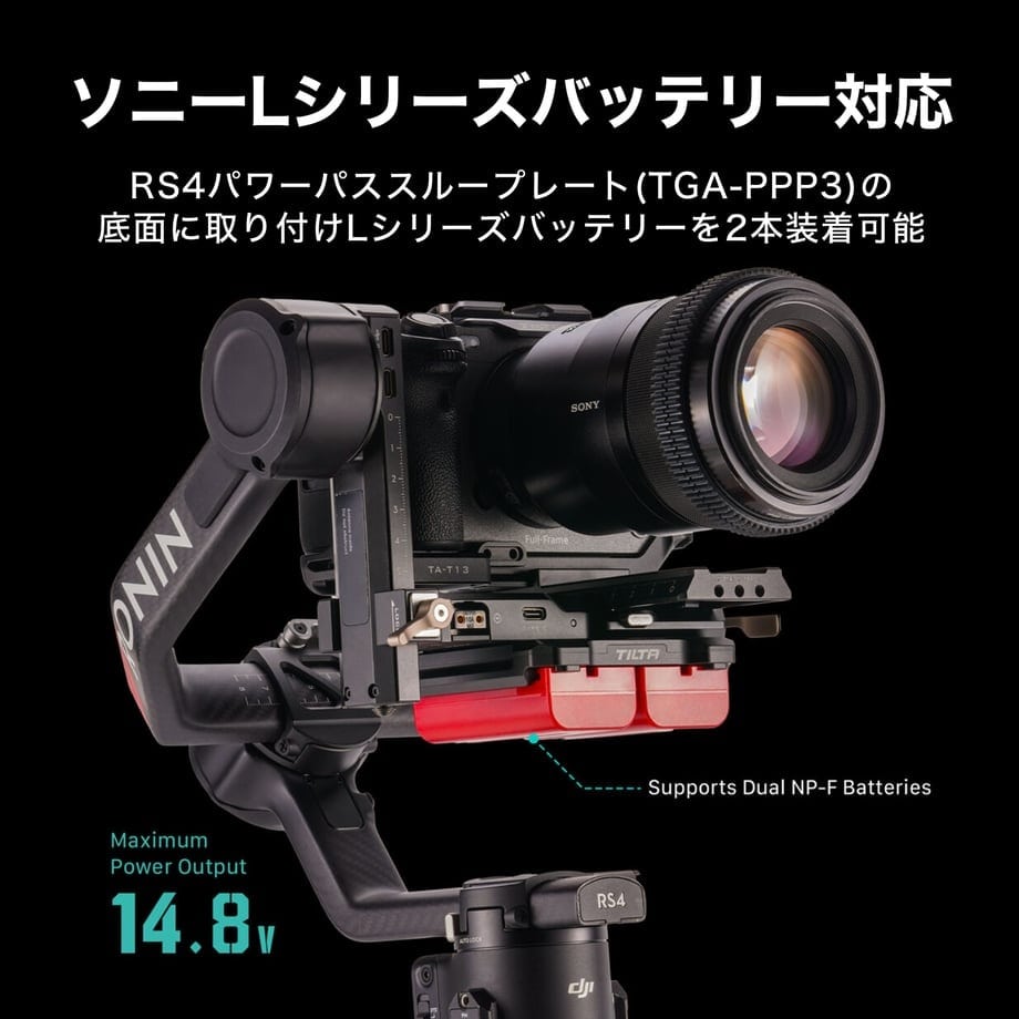 このLシリーズバッテリープレートは、RS4パワーパススループレートの底面に取り付け、デュアルソニーLシリーズバッテリーで駆動することができます。
