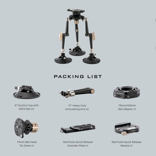 3つのNATOレール付き6インチ吸盤を備えており、さまざまな環境での車内外の撮影に最適です。