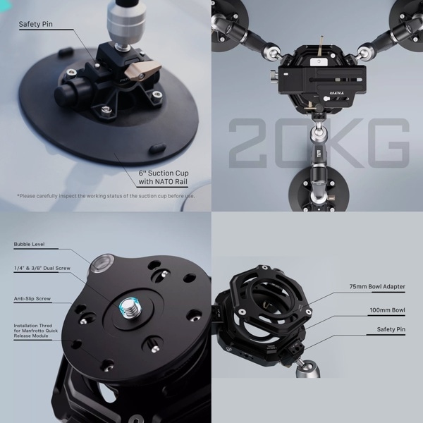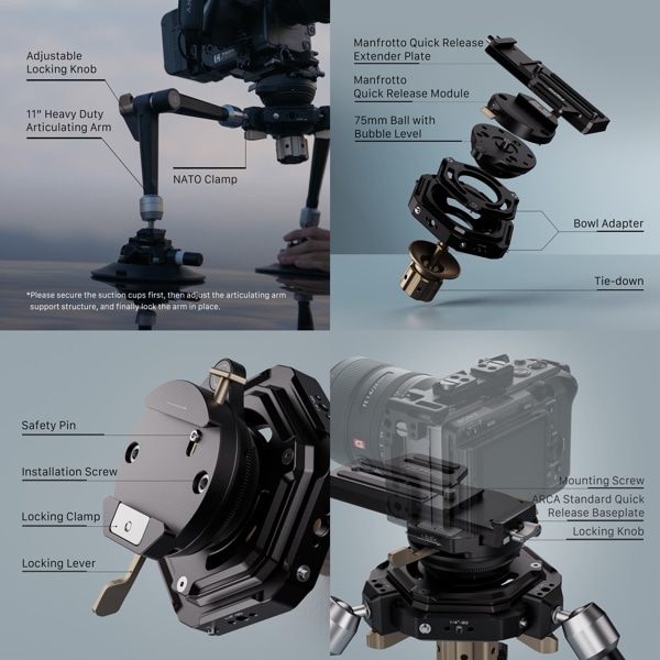堅牢な多関節アームと3つのNATOレール付き6インチ吸盤を備え、総耐荷重は20kg。さまざまな環境での車内外の撮影に最適。