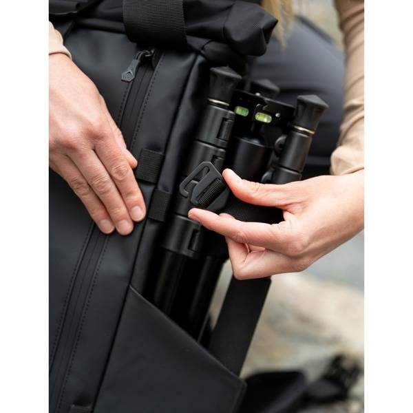 深めのサイドポケットには水筒や、小型三脚を収納可能。三脚用ストラップで固定し、安定した持ち運びを叶えます。