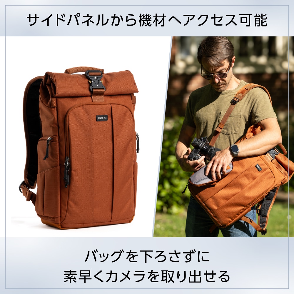 シンクタンクフォトの「フォーカスポイント」は、利便性と汎用性を追求して設計されたバックパックです。バックパネルとサイドパネルから素早くカメラにアクセスできます。