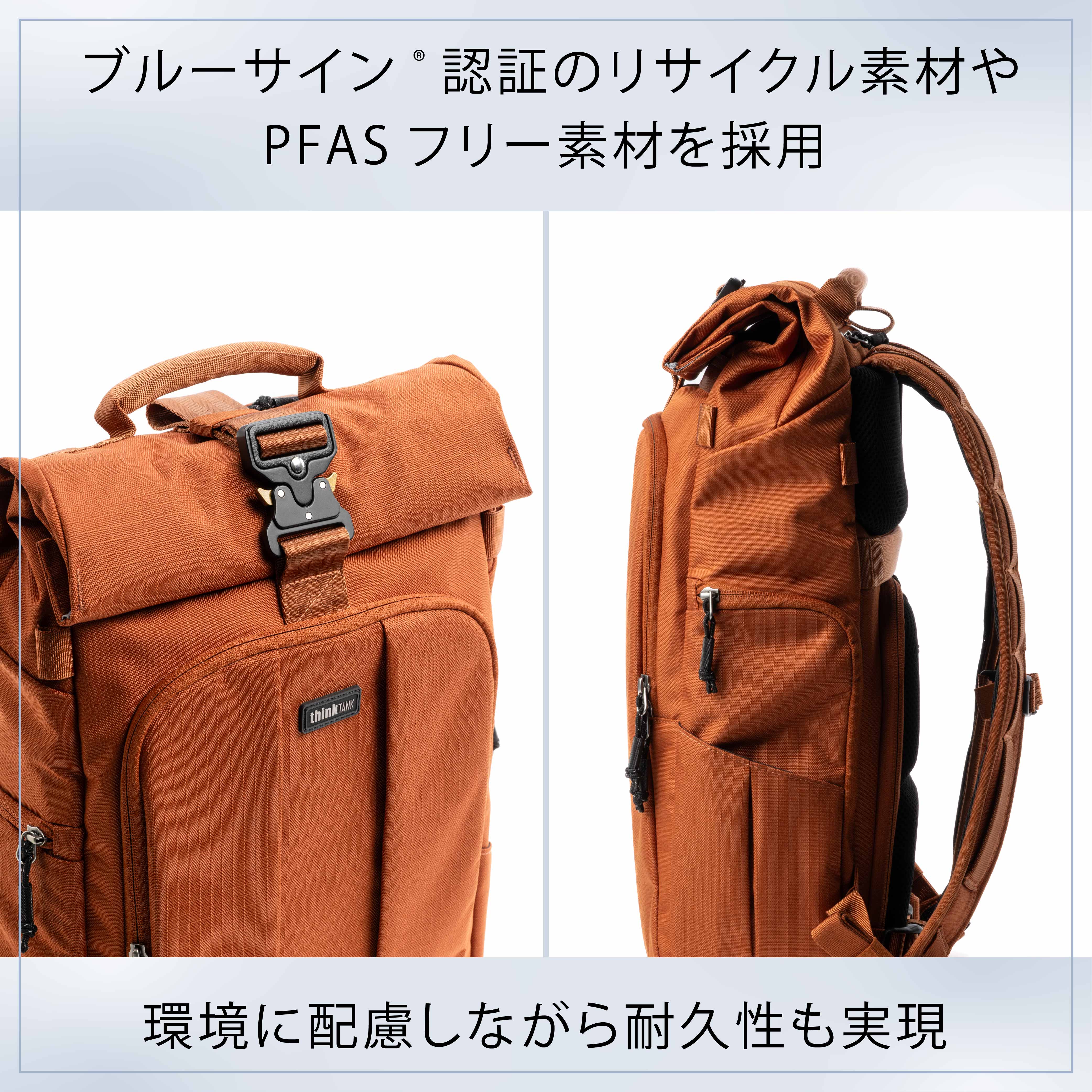 バッグにはBluesign®認証を受けたリサイクル素材やPFASフリー素材を採用。サステナブルでありながら高い耐久性を持ち、安心して使用できます。また、メインコンパートメントには信頼性の高いYKK® RC Fuseジッパーを使い、優れた耐候性を誇ります。