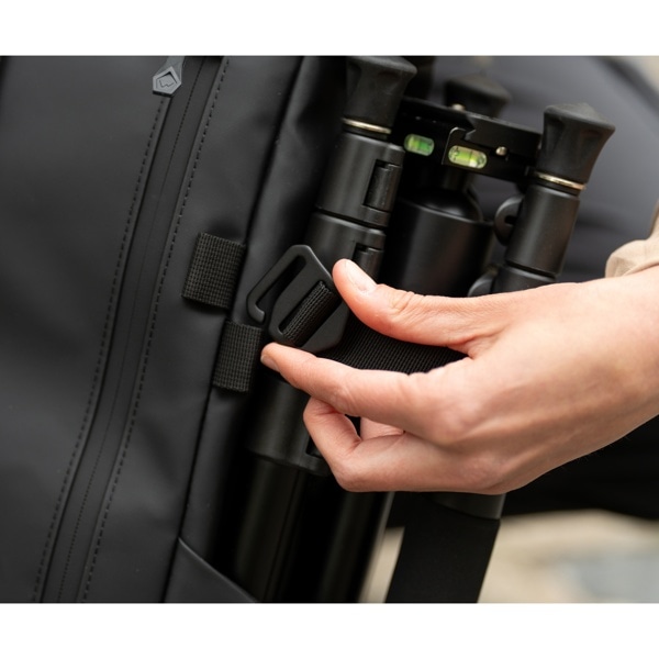バッグ表面や下部には、同梱のアクセサリーストラップスを使ってジャケットや三脚などを装着できます。